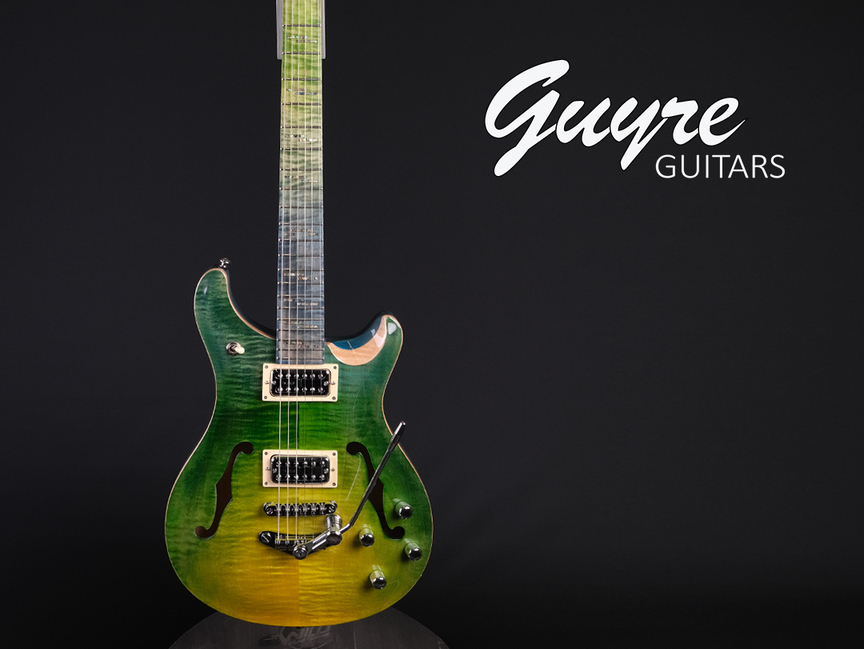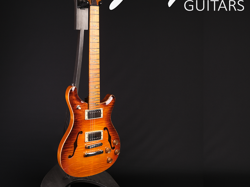 Avec le modèle Guy 6, découvrez le plaisir de jouer sur une guitare semi hollow. La finition Yellow Tiger glow met en valeur les veines de l'érable de la table pour donner à la guitare une classe